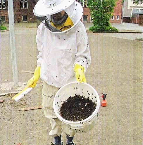 Roj je strasený priamo do úľa. Netreba sa báť včiel, roj je väčšinou naladený priatelsky (na obr. Dr.Pia Aumeier).